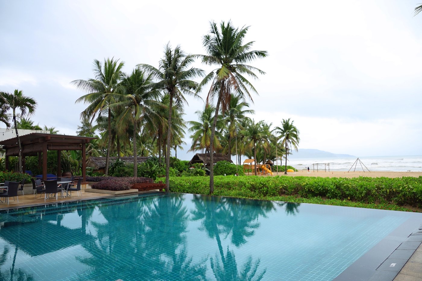 ↑수영장 너머로 파도가 넘실대고 있는 풍경이다.